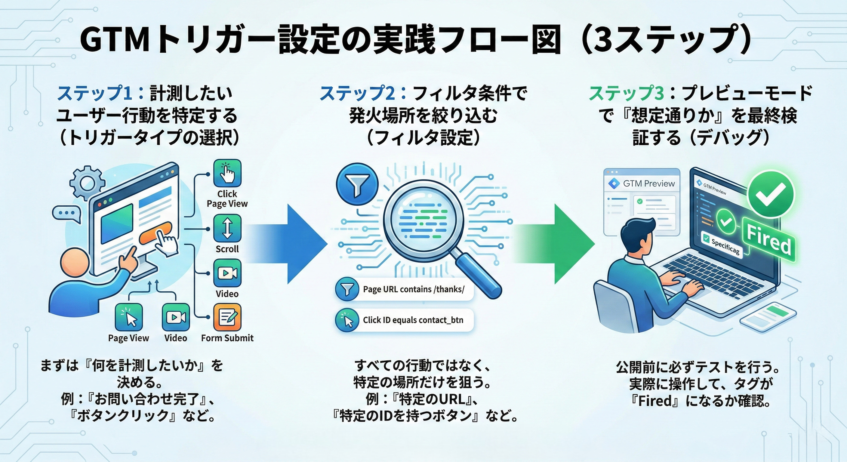 ユーザーの「ページを開いた」「ボタンを押した」といったアクションを検知し、タグを実行させるトリガーは、計測精度の鍵を握る重要な要素です。