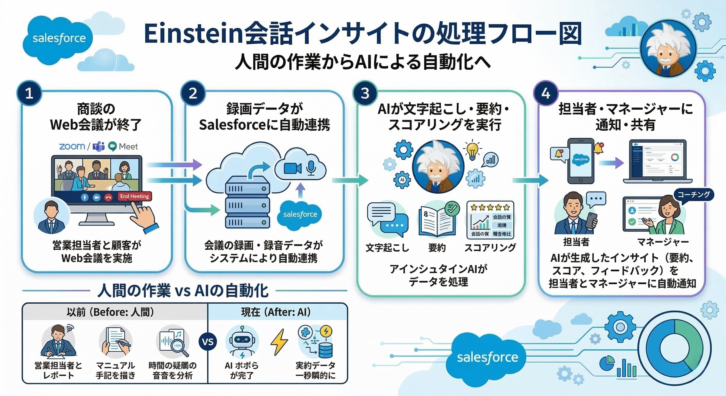 Salesforceの「Einstein会話インサイト」は、商談相手との通話データを録音・分析し、営業担当者の業務効率を大きく向上させるAIツールです。