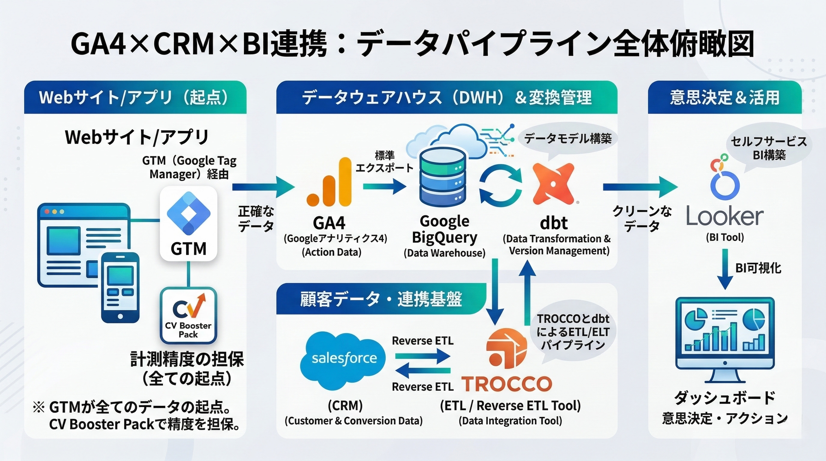 ここでは、データ転送ツールであるTROCCOを活用し、GA4、BigQuery、Salesforceを効率的に繋ぐ実装フローについて詳述します。