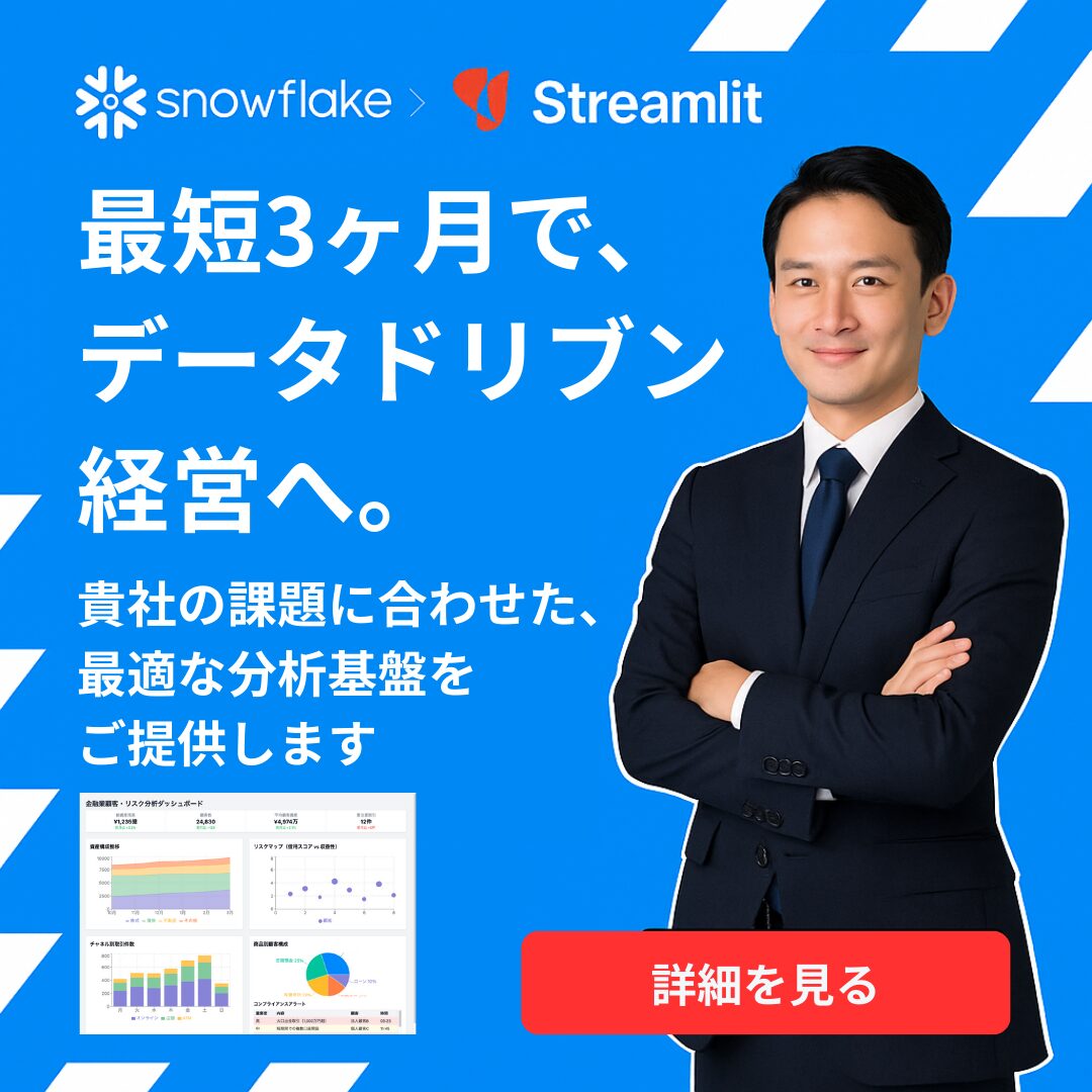 DX攻略部では、Snowflake×Streamlitを活用した統合BI基盤構築支援サービスを行っていますので、Snowflake導入を検討している企業様はぜひDX攻略部にご相談ください!