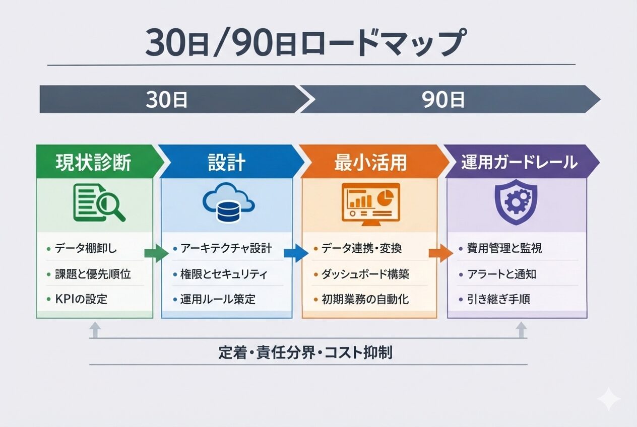 まずは30日で現状診断とKPI、90日で最小の活用(ダッシュボードと運用ルール)まで到達する計画を置くと、投資判断がしやすくなります。