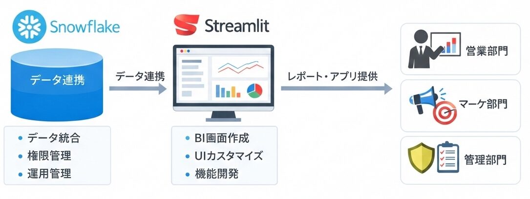 Streamlitはそのデータを使って、現場が欲しい切り口(期間、商品、顧客セグメントなど)で素早く画面化できるため、分析と現場活用で同じ数字を見ながら議論できます。