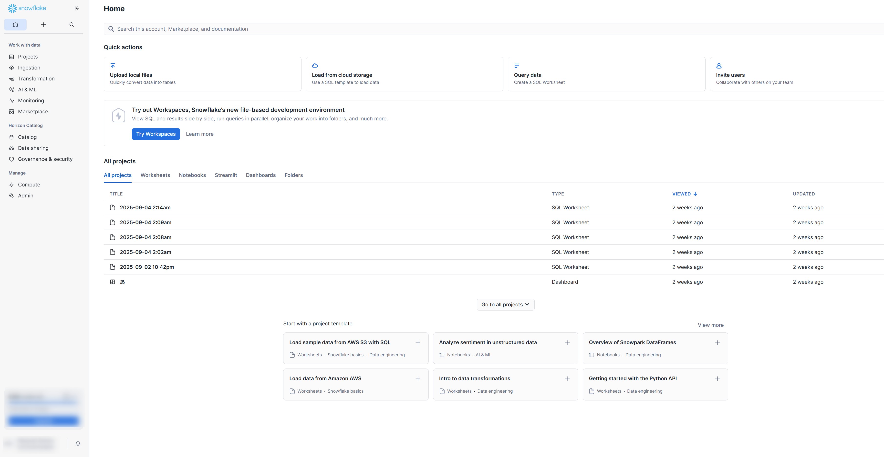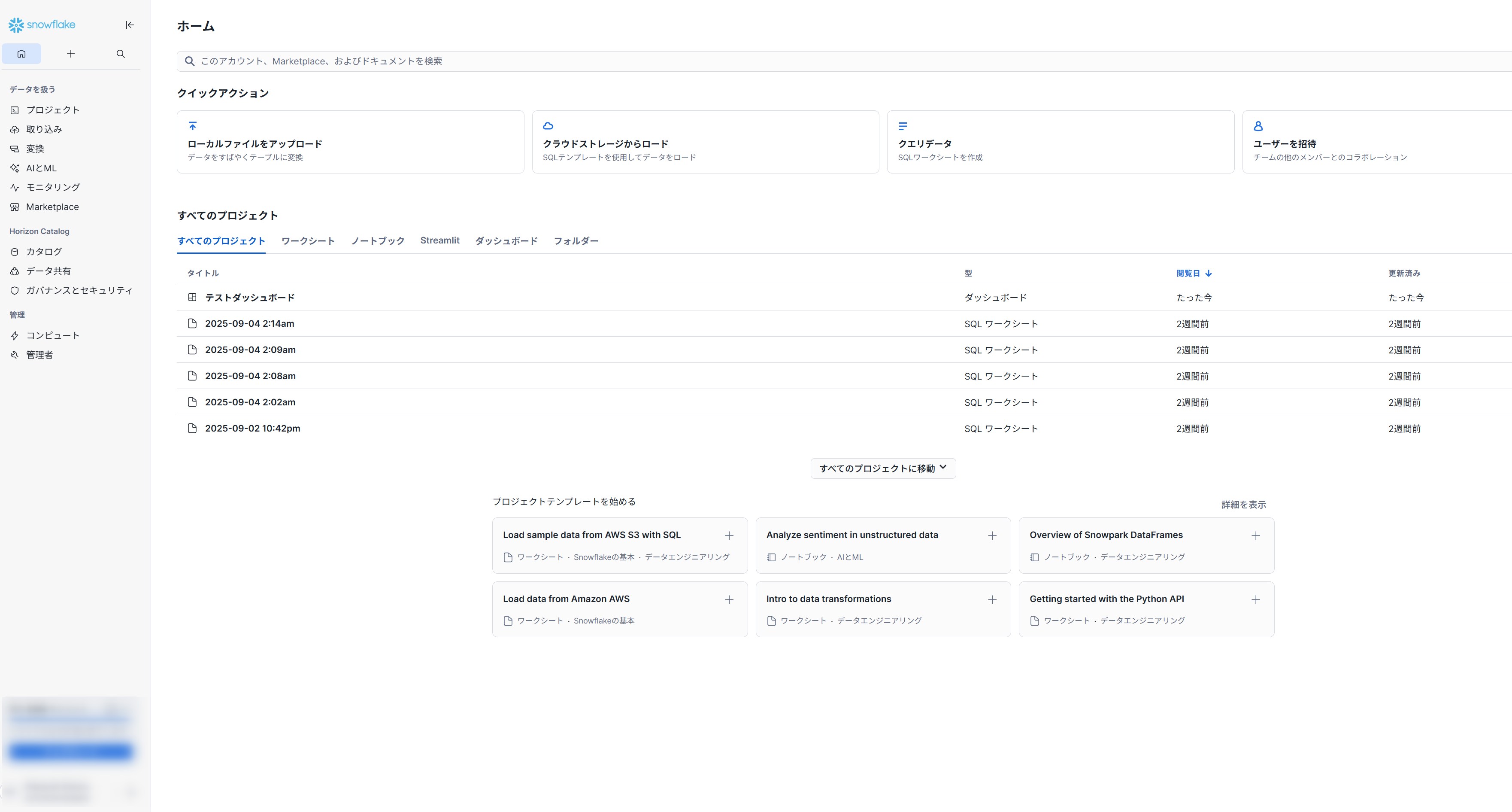 設定画面だけでなく、Snowflakeのトップ画面も日本語になっているのが確認できれば、日本語化成功です。