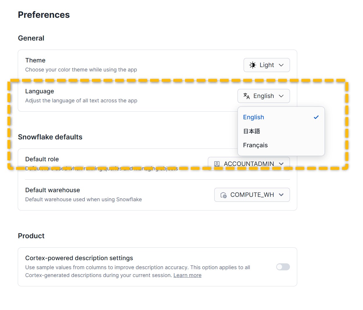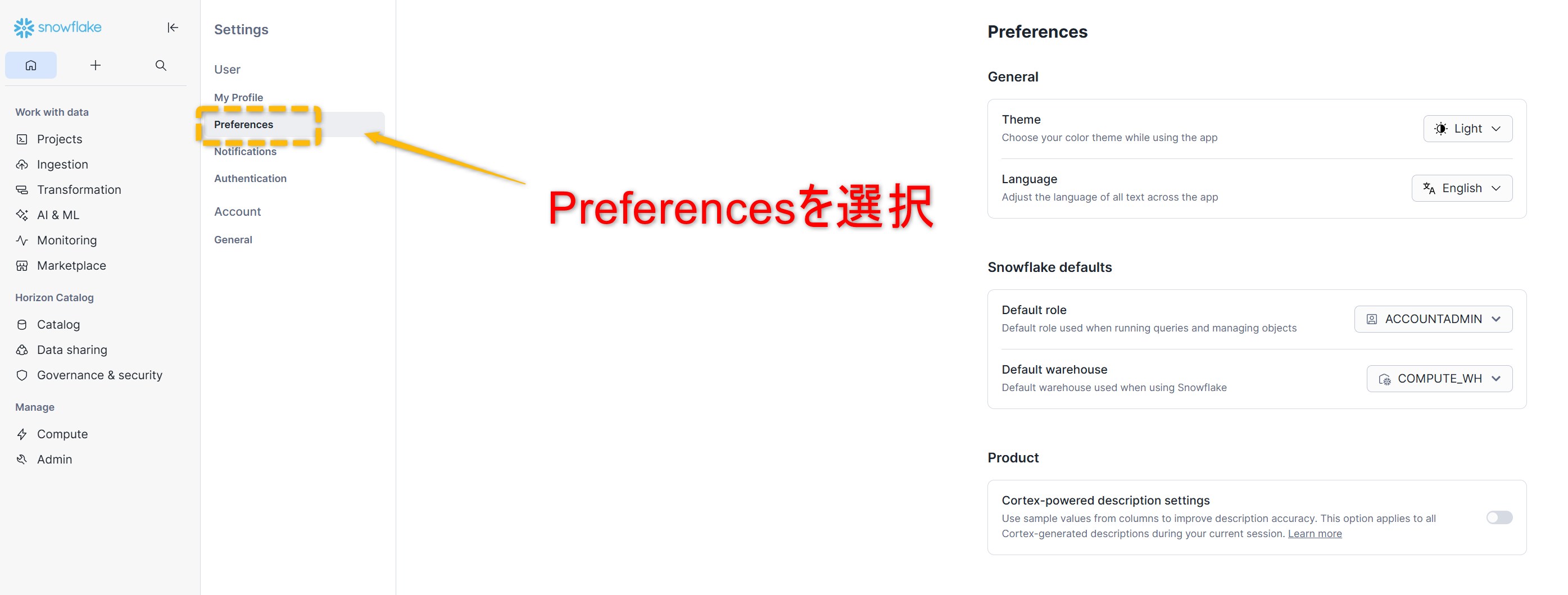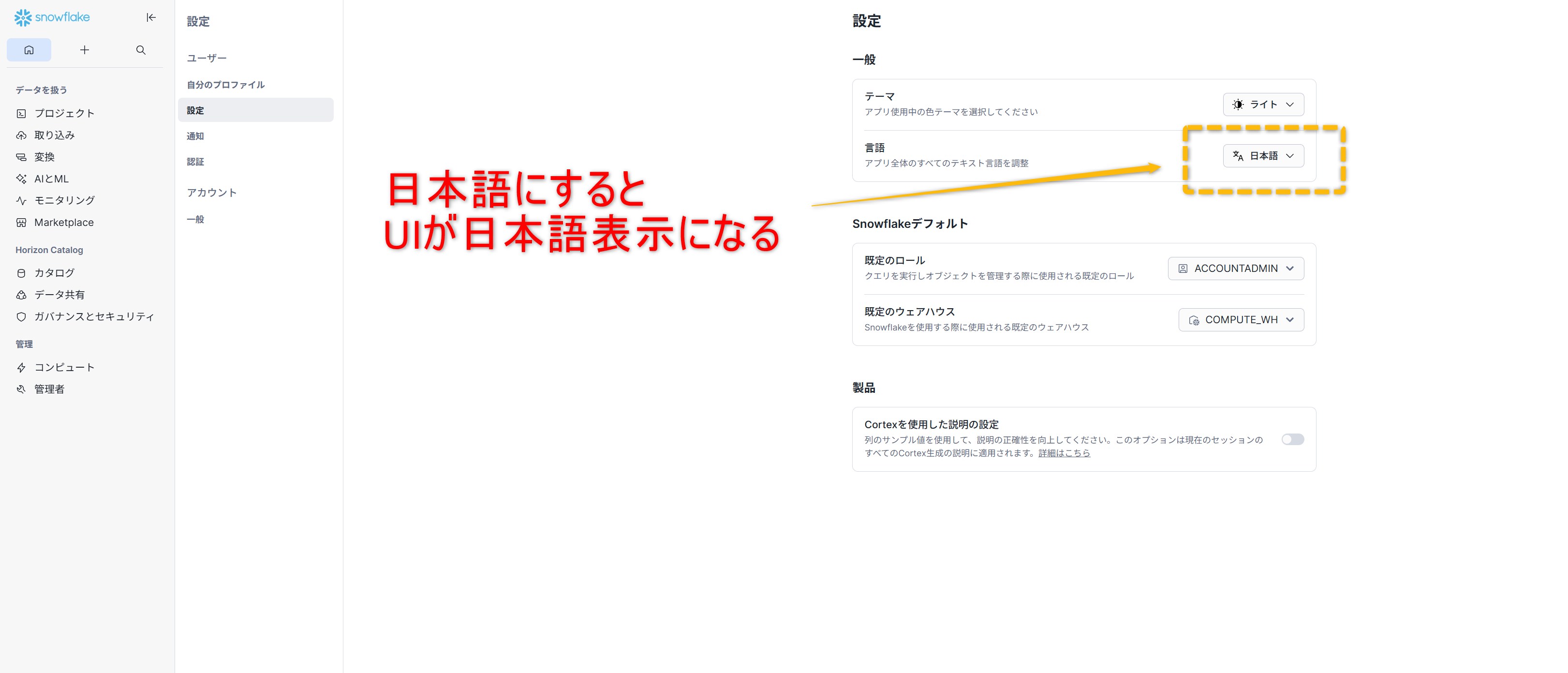 Languageの「English」を「日本語」に変更すると、Snowflakeが日本語化されます。