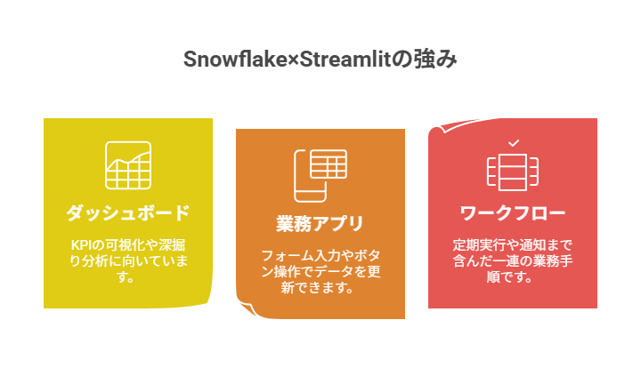 Snowflake×Streamlitの強みは「見る」「操作する」「流す」を同じ場所で扱えることです。