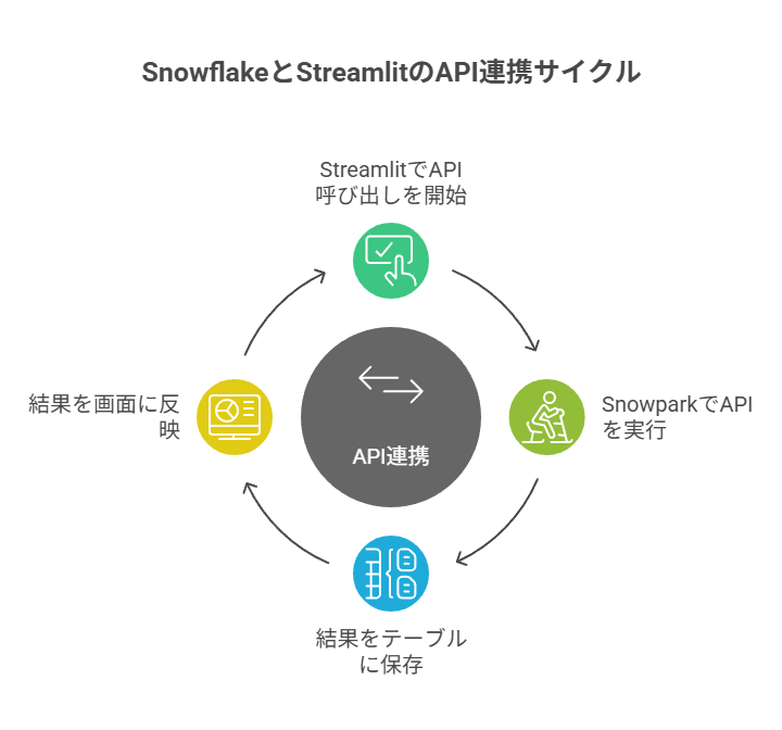 SnowflakeとStreamlitを使った、外部API連携の基本パターンは以下のような形です。
