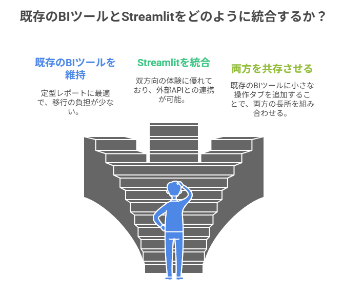 Streamlitを選ぶかどうかは、現場が自分で触る前提か、入力や承認などの操作があるか、要件が頻繁に変わるか、そしてデータを社外に出したくないか、といったことが関わってきます。
