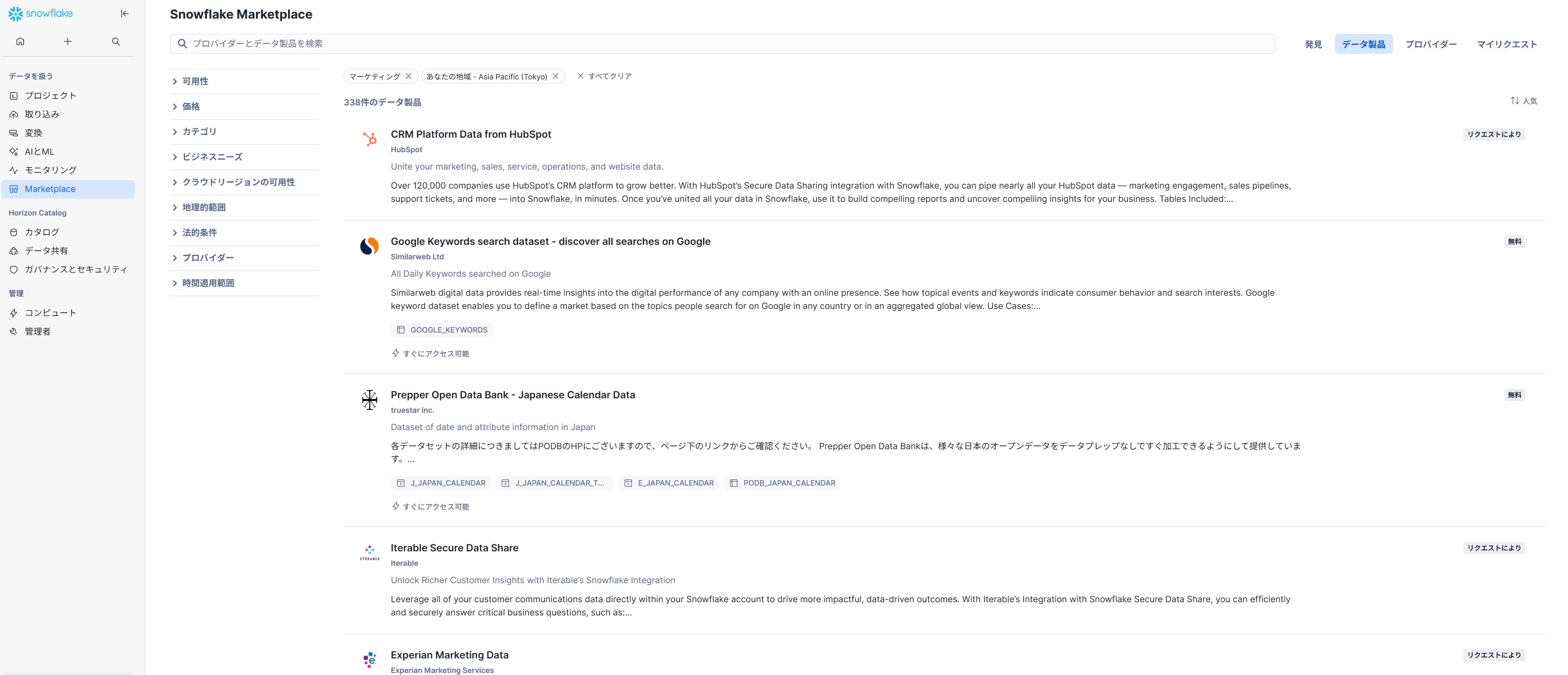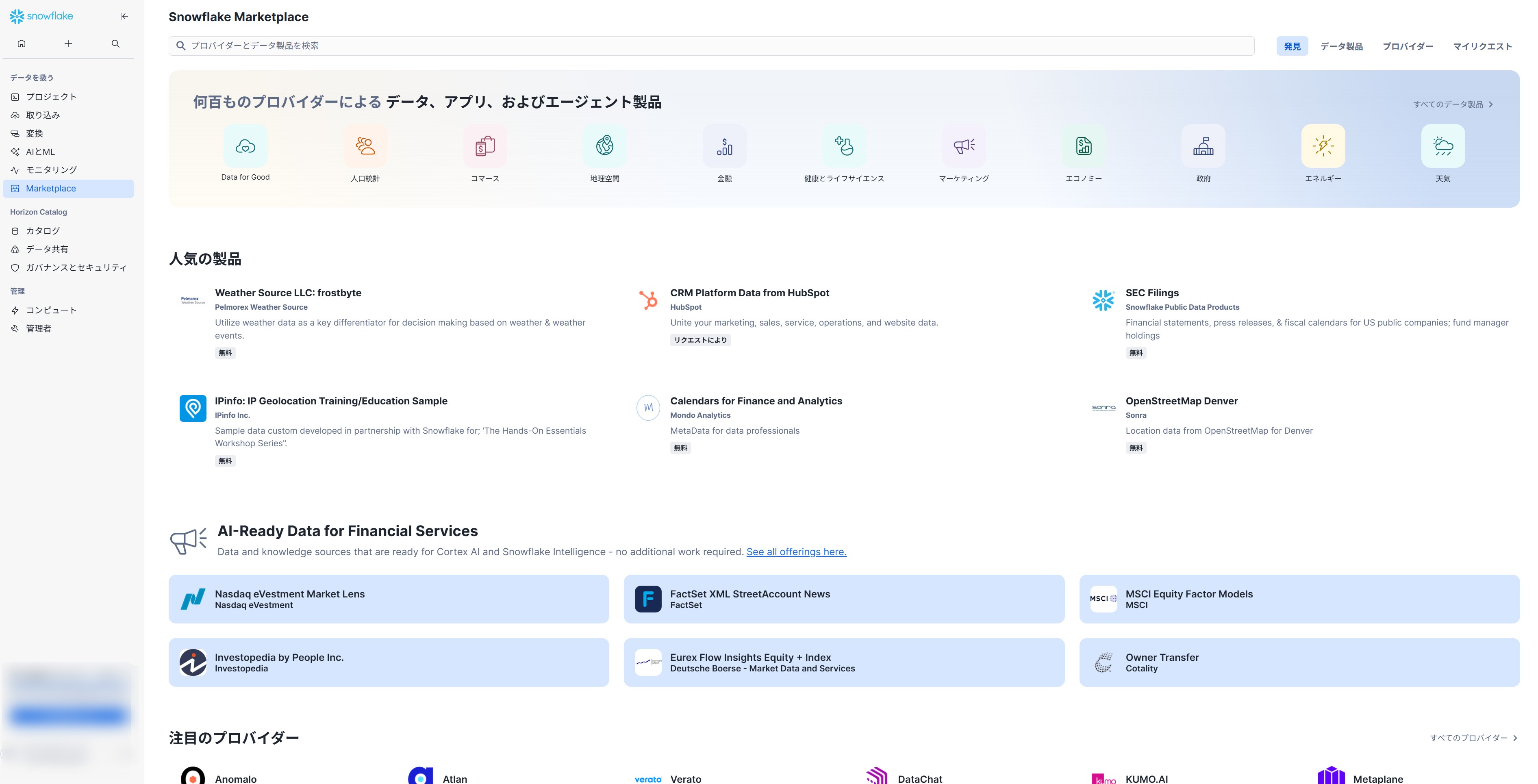 MarketplaceはSnowflake内でデータや機能やアプリを探して契約し、そのまま自アカウントで利用開始するための公式カタログです。