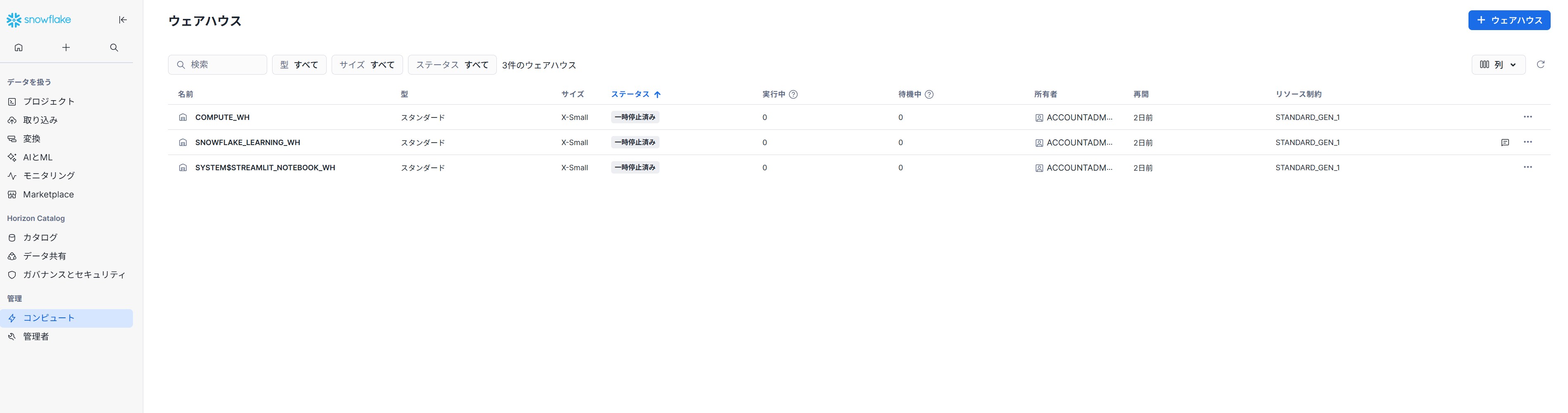 ウェアハウスはSnowflakeでクエリを実行するための計算リソースの束です。