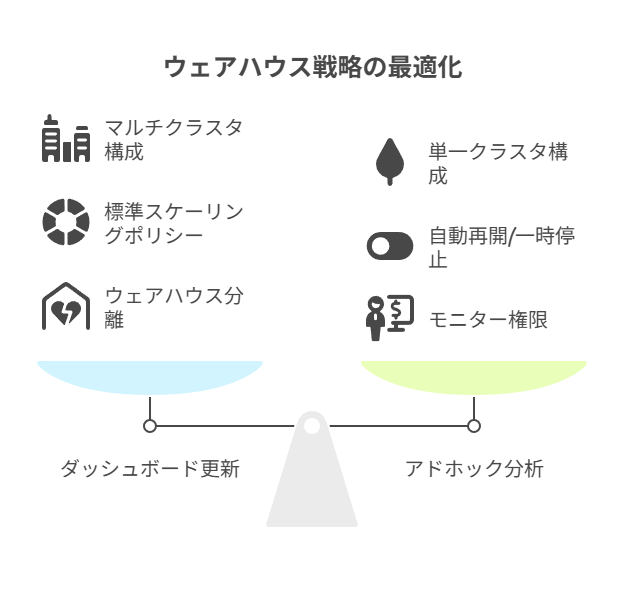 BIは同時実行に備えてマルチクラスタ、ETLは短時間で回す単一クラスタの高火力など、用途に合った設計がしやすくなります。