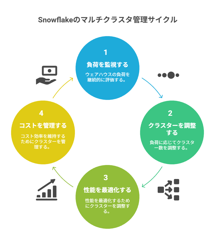 ウェアハウスは計算の器であり、サイズ、自動サスペンド、必要に応じたマルチクラスタ、スケーリングポリシーの使い分けで、性能とコストのバランスを取りやすくなります。