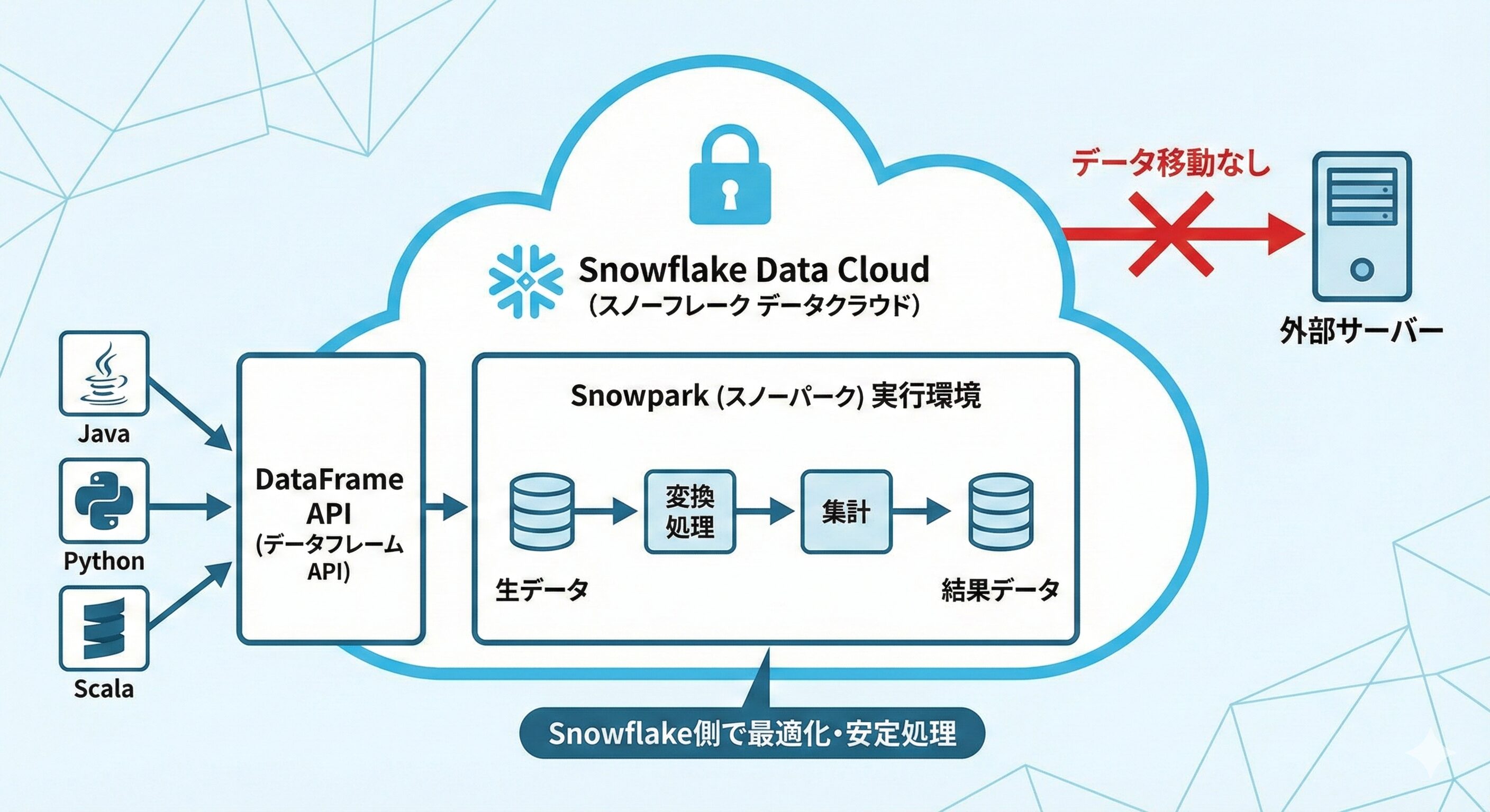 Snowparkは、データを外に移動せずにSnowflake上で処理するための開発用ライブラリ(API)です。