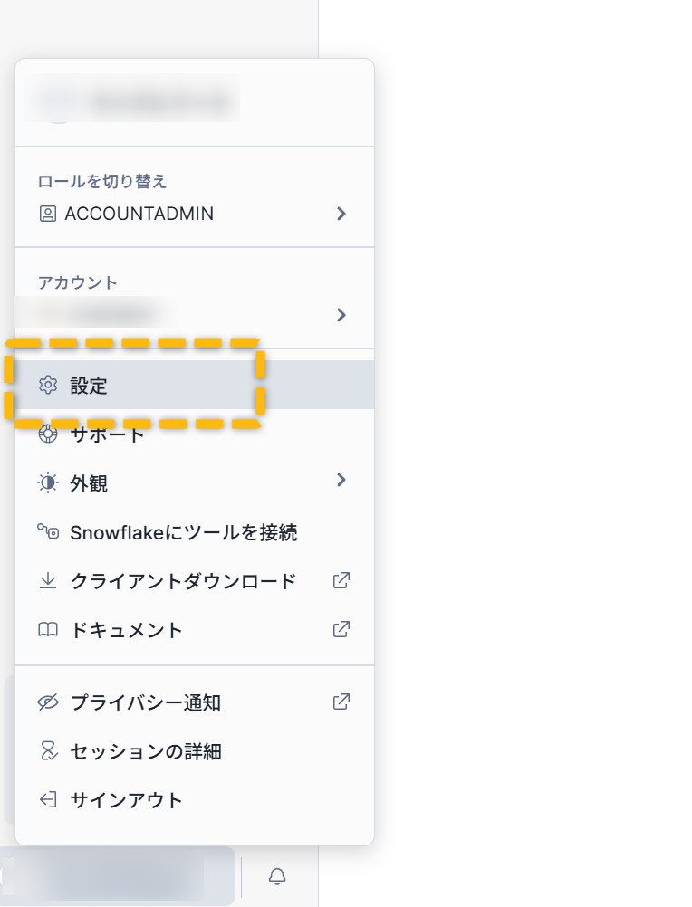 Snowsightの左ナビ最下部にある自分のユーザー名(または丸いアイコン)をクリックしましょう。