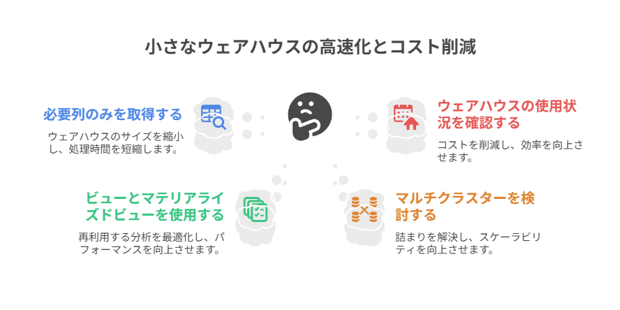 ウェアハウスは、小さく始めて必要列だけ取得、再利用する分析はビューやマテリアライズドビュー化します。