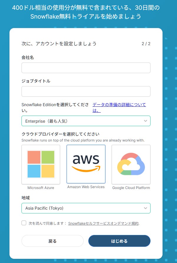 Snowflakeのトライアル申し込みページからメールアドレスなどを入力すると、30日間・400ドル分の利用枠つきトライアルアカウントを作成できます。