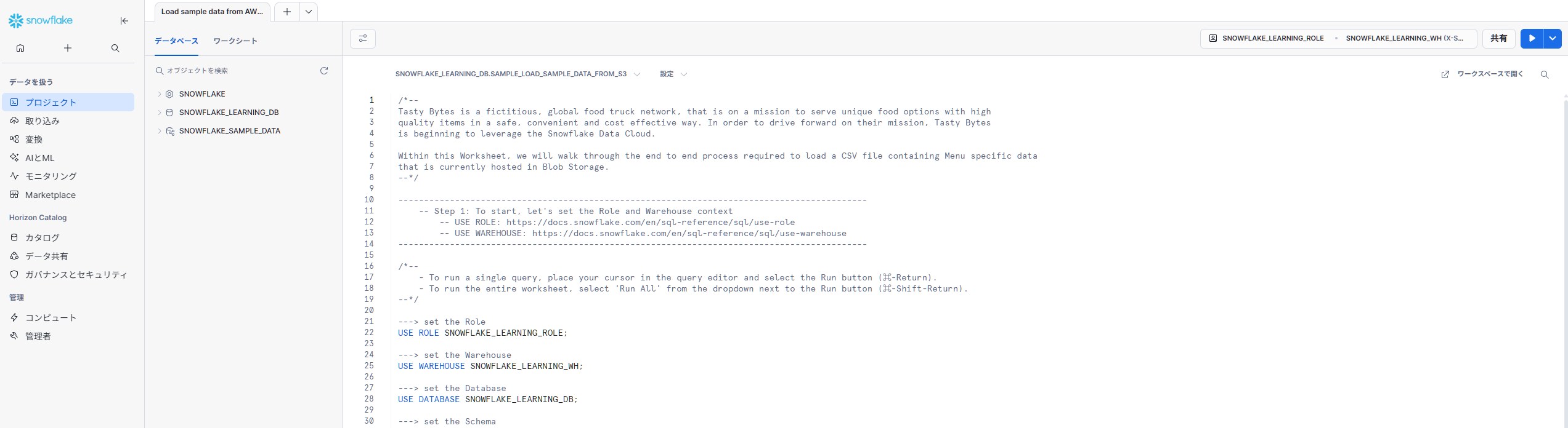 次に、Snowflakeが用意しているサンプルデータベースとチュートリアルを使って、基本的なSQLを試してみました。