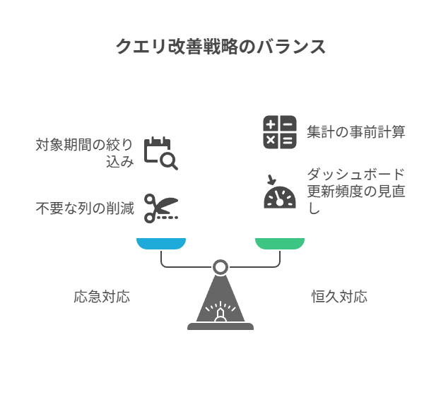 恒久対応は、集計の事前計算や、ダッシュボード更新頻度の見直しなどに広げていきます。