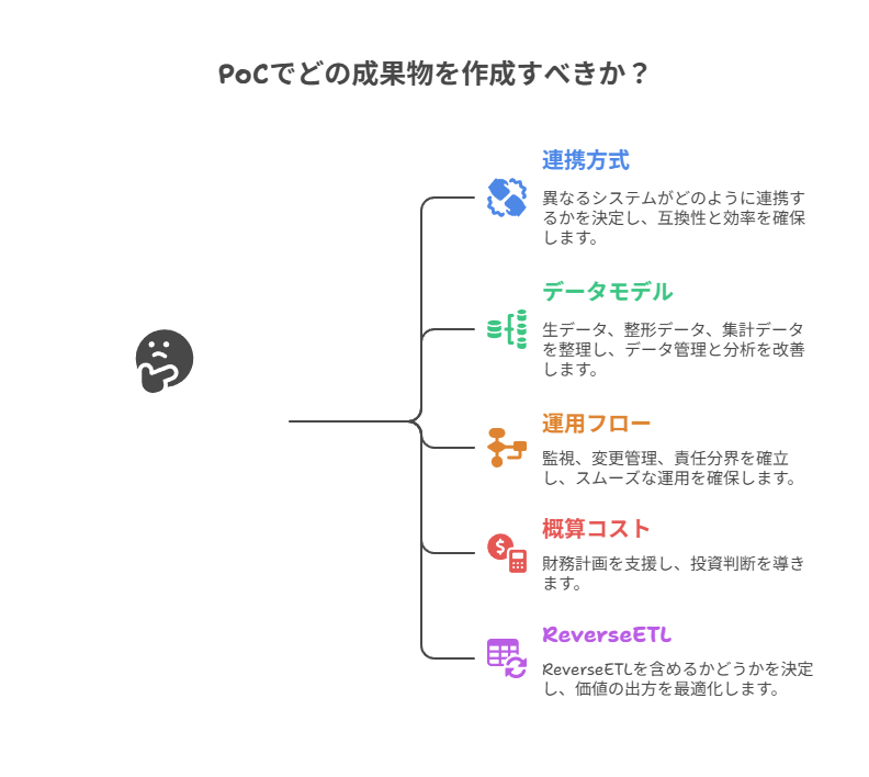 PoC(概念実証)では、連携方式の選定、データモデル(生データ、整形データ、集計データの分け方)、運用フロー(監視、変更管理、責任分界)、概算コストの見立てまでを成果物にすると、次の投資判断がしやすくなります。